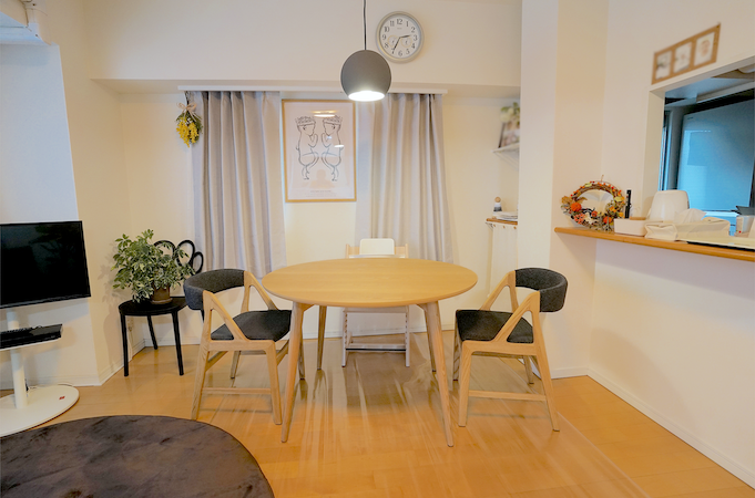 ダイニングテーブルは丸型を採用し、テーブルの存在感を軽減↓↓